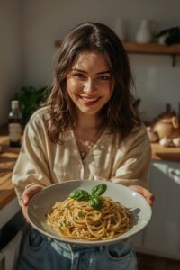 A escolha dos ingredientes muda tudo. O macarrão serve como tela — ele segura o molho e libera amido que ajuda a ligar os sabores. O manjericão traz frescor e perfume que cortam a gordura do azeite. O alho dá personalidade: suave quando dourado, mais forte cru. Use pouco, mas escolha bem: um fio de azeite de qualidade, algumas folhas de manjericão rasgadas na hora e o alho certo transformam a refeição.